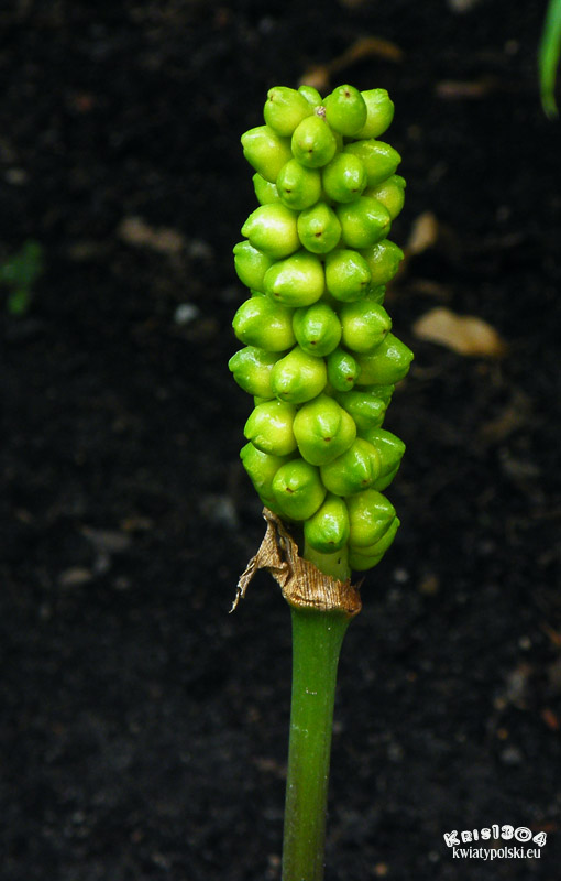 | OPIS | Kwiaty brązowe, w maczugowatej kolbie otulonej białozielonkawą pochwą.