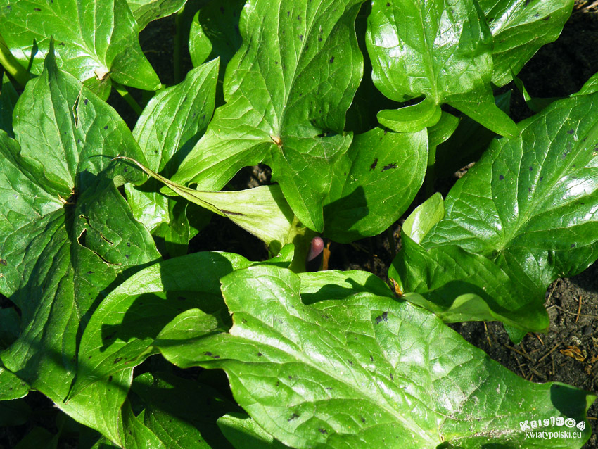 | LIŚCIE | Strzałkowate, często z ciemnozielonymi lub brązowymi plamami.