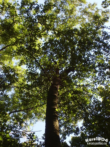 | POKRÓJ | Drzewo osiągające wysokość do 40 m z rozłożystą koroną. Ma dużą zdolność do tworzenia odrostów ze ściętych pni. Pień dość gruby (u podstawy bywa zgrubiały), zwykle nieco pochylony, prawie zawsze widoczny aż do wierzchołka, często już przy samej ziemi podzielony na dwie, rzadziej więcej równorzędnych części. Korona młodych drzew regularnie (wąsko) stożkowata, z czasem staje się szersza, bardziej nieregularna i zaokrąglona na szczycie, nigdy jednak nie jest bardzo szeroka. Konary niezbyt grube, ustawione w dość symetrycznych okółkach, w dolnej części korony prawie poziome, u góry łagodnie ukośnie wzniesione.