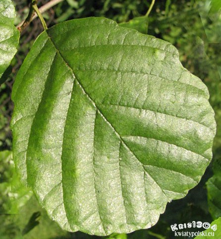 | LIŚCIE | Długość 4-10 cm, szerokość 3-7 cm, odwrotnie jajowate, z tępym, lub wyciętym wierzchołkiem, brzeg nierówno podwójnie piłkowany i falisty. Wierzchnia strona błyszcząca. Od głównego nerwu odchodzi 5-8 par nerwów bocznych. Po spodniej stronie w kątach nerwów kępki włosków. Młode liście są nieco lepkie. Ulistnienie skrętoległe.