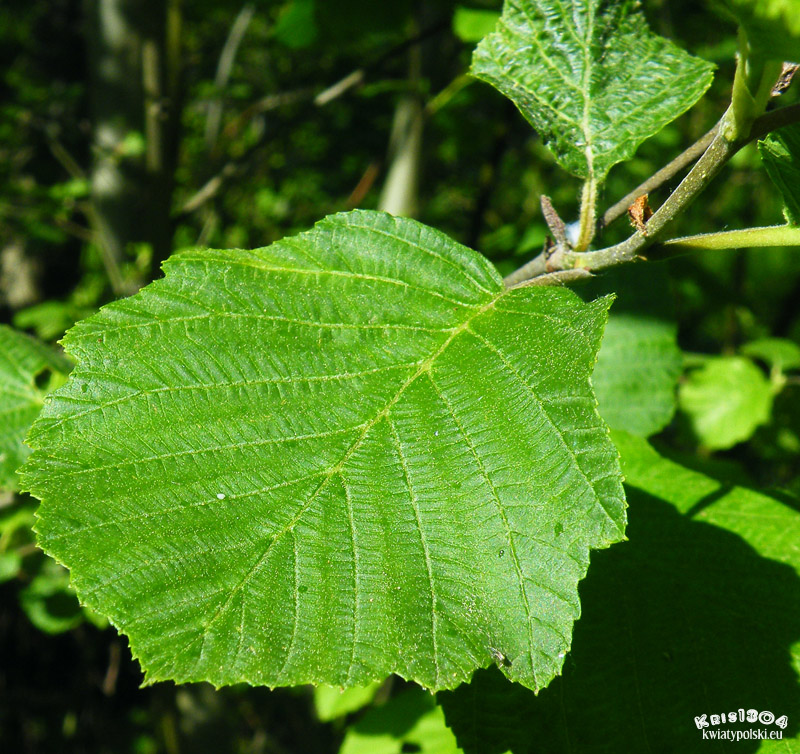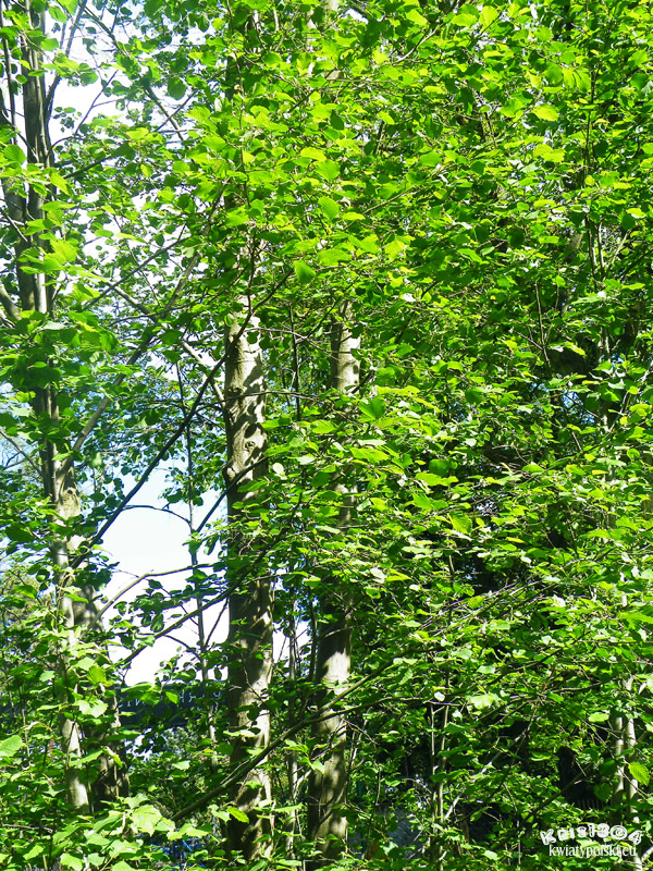 | LIŚCIE | Opadające na zimę, skrętoległe, do 10 cm długości, o brzegach podwójnie wcinano piłkowanych, ostro zakończone, u nasady zaokrąglone. Z wierzchu ciemnozielone, pod spodem szarozielone do niebieskawych. Młode filcowato owłosione, starsze tylko na nerwach. Jesienią nie przebarwiają się tylko trochę jaśnieją i opadają zielone.