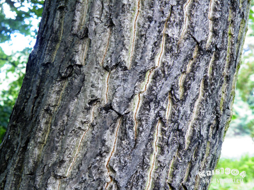 | KORA, PĘDY | Kora ma szarą barwę. Jest szorstka i płytko bruzdowana. Młode pędy są gęsto pokryte lepkim, krótkim, białym kutnerem. Blizny liściowe są duże i jasne oraz mają kształt koniczyny.