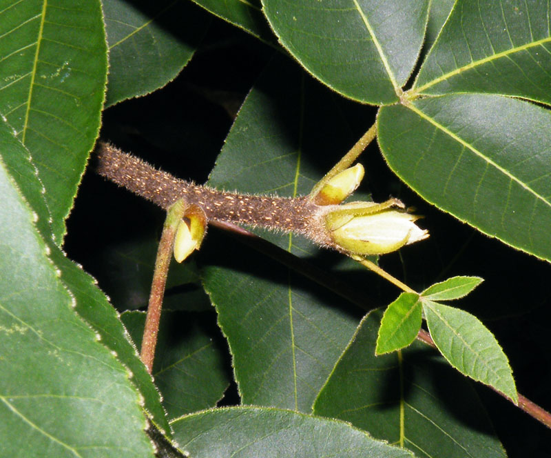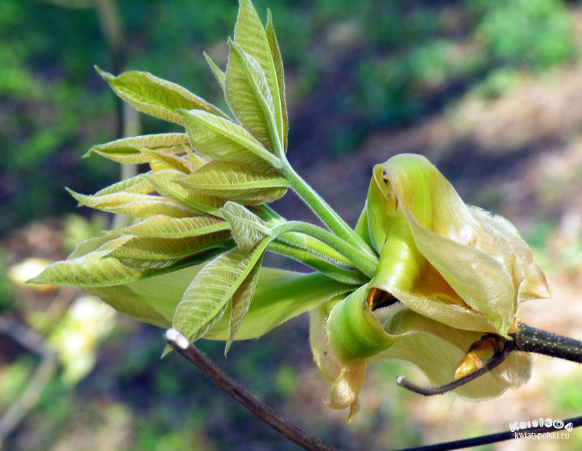 | LIŚCIE | Liście nieparzystopierzaste składające się z 5 (bardzo rzadko z 7) listków. Szczytowy listek jest największy i może osiągać nawet do 30 cm długości. Listki są eliptyczne lub odwrotnie jajowate, piłkowane. Listki są grube i często tłuste. Ogonek liściowy jest sztywny i jest zwykle owłosiony tylko u nasady. Są prawie nagie, choć rudawe owłosienie może się pojawiać na brzegach liści. Jesienią przebarwiają się na złotożółty kolor.