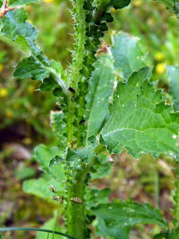 | LIŚCIE | Dolne pierzasto-dzielne, górne zatokowo-klapowane. Całe są rzadko owłosione, z czasem łysiejące. Brzegi mają silnie kolczaste.