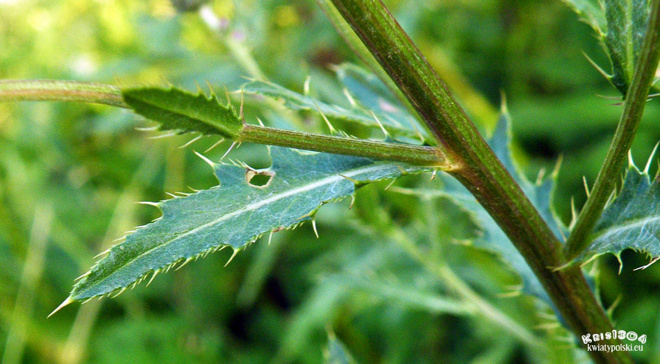 | LIŚCIE | Wydłużone, o bardzo zmiennym kształcie: od wrębnych, aż po sieczne, kolczaste. Z wierzchu zielone i nagie, pod spodem szarawe z kutnerowatym nalotem. Dolne na krótkich ogonkach, pozostałe siedzące.