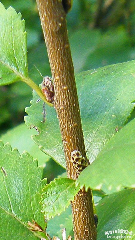 | KORA, PĘDY | Młode pędy gęsto pokryte białymi brodawkami o końcach czasami nieco owłosionych. Pędy skrócone drobne. Kora wszystkich pędów ciemnoszara.