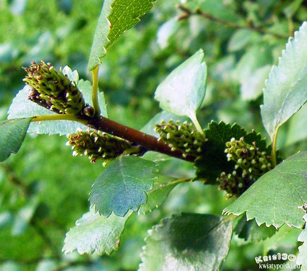 | OPIS | Kwiaty zebrane w wiotkie i zwisające kotki, oddzielnie kotki męskie i kotki żeńskie. Jest rośliną jednopienną - na jednej roślinie występują zarówno kotki męski, jak i żeńskie. Kotki męskie o długości do 20 mm występują już w jesieni, są wówczas drobne i sterczące. Mniejsze kotki żeńskie mają długość 8-15 mm.