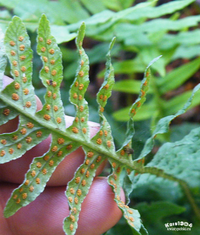 | OPIS | Liście płonne nie różnią się od zarodnionośnych. Zarodniki na spodniej stronie odcinków, zebrane w duże (2,5 mm), okrągłe, żółte kupki zarodni bez zawijki, ułożone w dwóch szeregach wzdłuż nerwów bocznych.