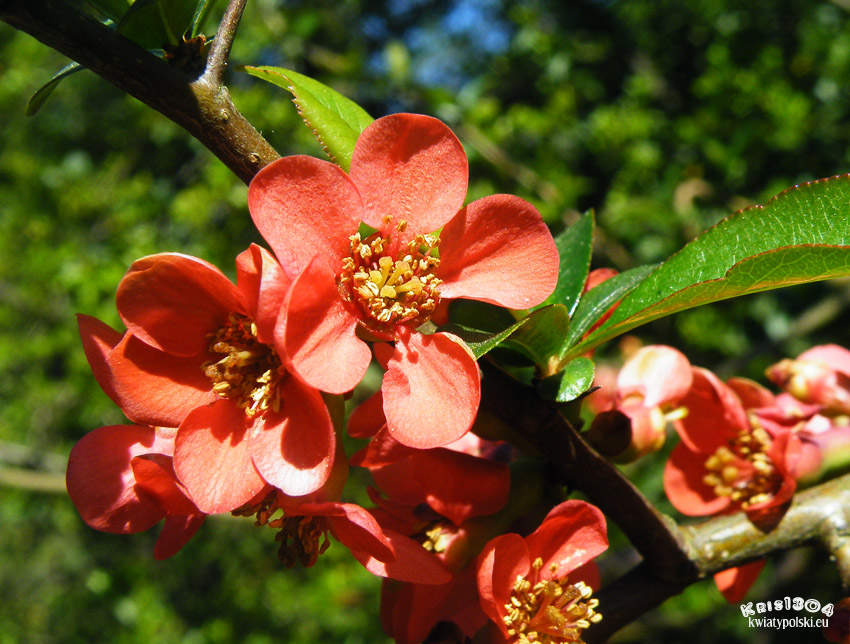 | OPIS | Bardzo efektowne, pojedyncze, skupione po 2-4 razem. Kwitnie obficie przed rozwojem liści, na zeszłorocznych pędach, 5-płatkowe, czerwone.
