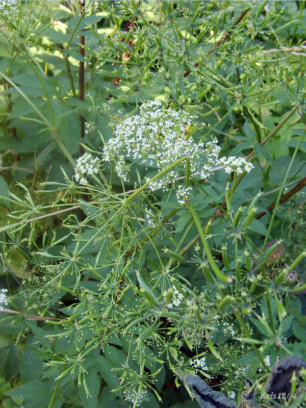 | OPIS | Drobne kwiaty tworzą duże, podwójne baldachy. Baldachy 12-13 szypułowe, bez pokryw i pokrywek. W poszczególnych baldaszkach jest 12-20 pojedynczych kwiatów na równej długości szorstkich szypułkach. Kwiaty są przedprątne, obupłciowe lub męskie. Płatki korony białe lub jasnoróżowe, o wierzchołkach zagiętych do środka.