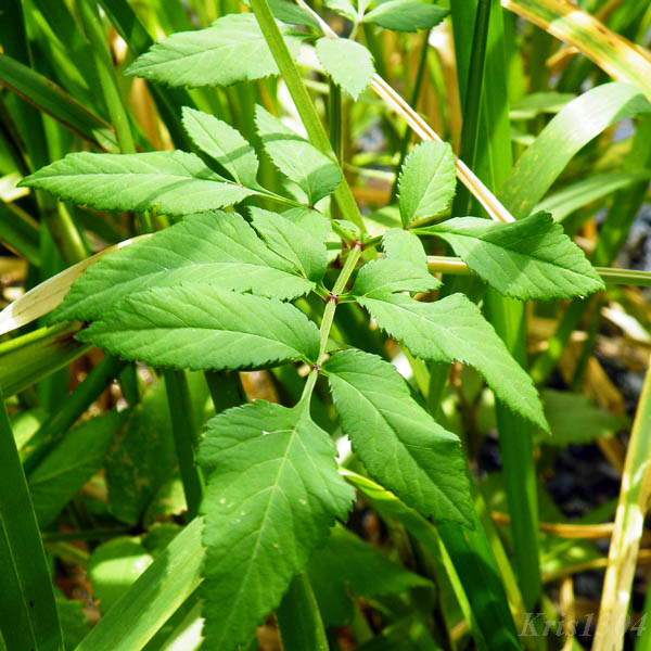 | LIŚCIE | Odziomkowe i dolne łodygowe są długoogonkowe, podwójnie trójlistkowe; środkowy listek jest największy. Poszczególne listki są niesymetrycznie jajowate, zaostrzone, pojedynczo lub podwójnie piłkowane, ogonkowe. Dolne liście pochwiasto osadzone na łodydze. Liście górne są pojedynczo trójdzielne.