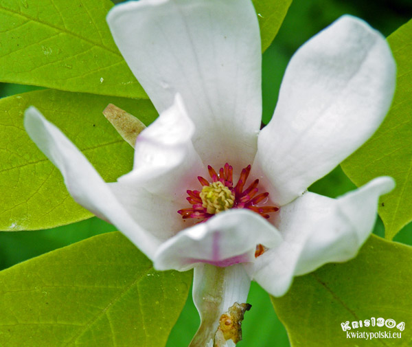 | OPIS | Kwiaty wyrastają z pączków kwiatowych na końcach pędów. Pączki te są większe od pączków liściowych i okryte są 1 lub 2 szczeciniasto owłosionymi łuskami. Bardzo duże (średnica 10-20 cm) i kielichowate kwiaty są największą ozdobą magnolii. Kwiaty purpurowoczerwone do biaych, ciemniejsze u nasady, z jaśniejszymi brzegami. Przez środek płatków biegnie pręga.