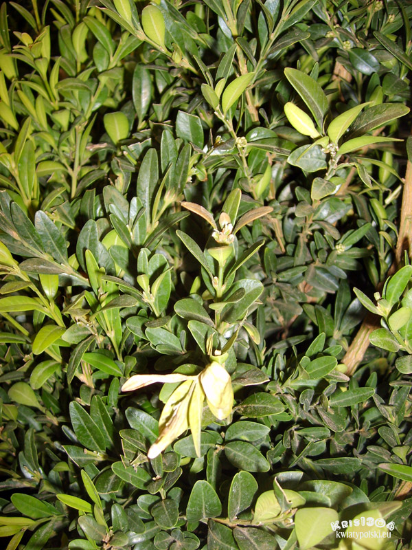 | UWAGI | Jest rośliną długowieczną, rośnie powoli, ale może osiągnąć nawet wysokość 9 m i wykształcić pień o średnicy 30 cm. Inne nazwy: bukszpan wieczniezielony. |