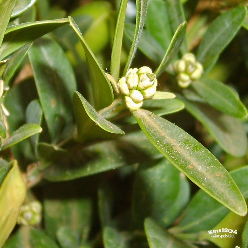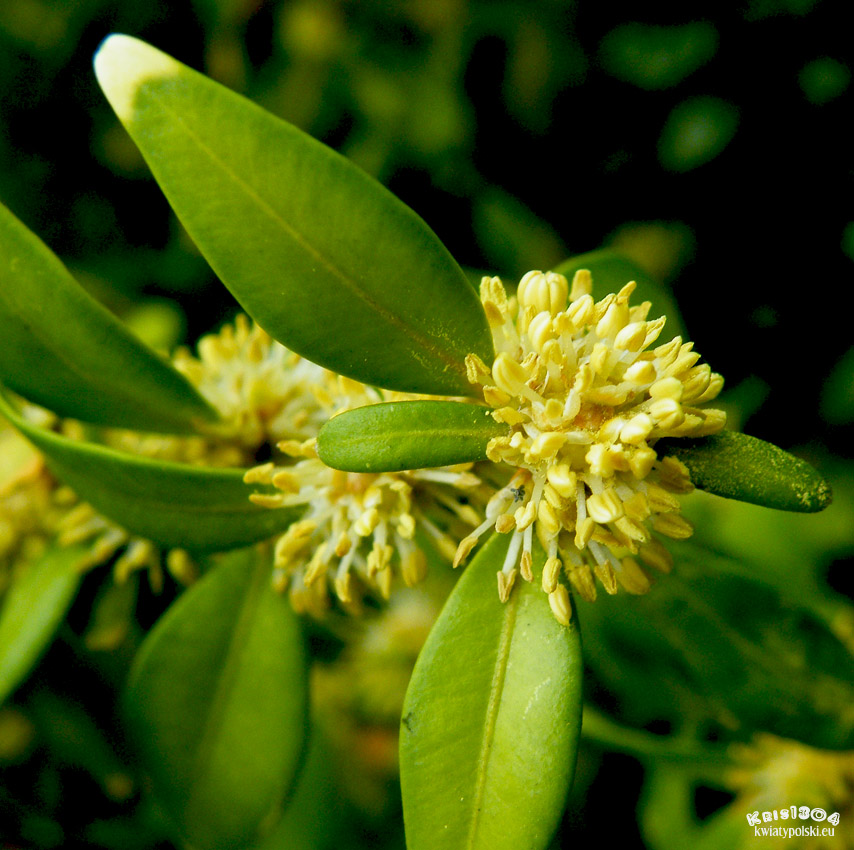 | LIŚCIE | Skórzaste, błyszczące, eliptyczne, ciemnozielone liście ustawione naprzeciwlegle na pędach, bardzo gęsto. Mają charakterystyczny zapach.