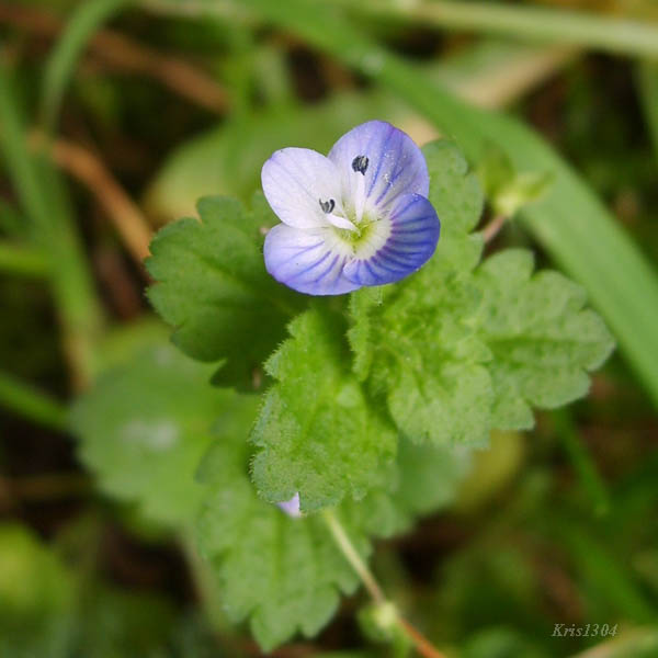 | OPIS | Kwiaty wyrastają pojedynczo w kątach liści, na szypułkach przeważnie znacznie dłuższych od przysadki. Po przekwitnięciu szypułki odginają się. Przysadki są bardzo podobne do liści i nie zmniejszają się w wyraźny sposób ku wierzchołkowi pędu. Kielich wolny, złożony z 4 podługowatych lub jajowatych i ostro zakończonych działek. Korona 4-płatkowa, kółkowa z bardzo krótką rurką, w gardzieli jest żółtawobiała. Kwiaty są jaskrawoniebieskie. Dolna łatka jaśniejsza, często biała, korona o średnicy 8-12 mm.
