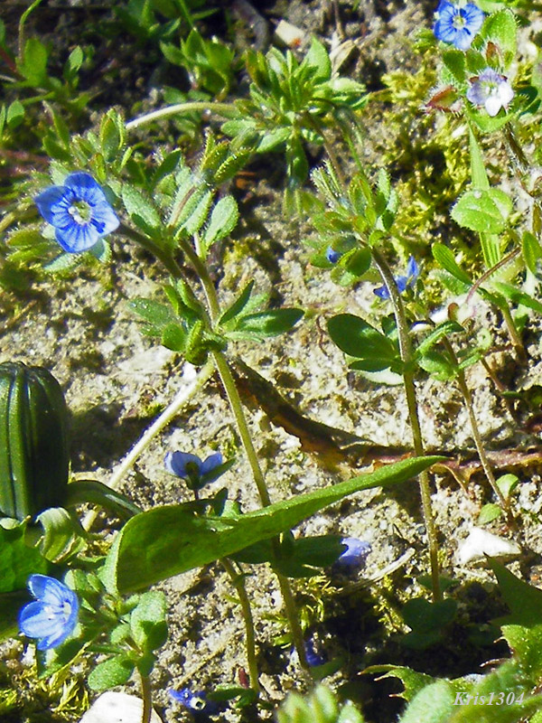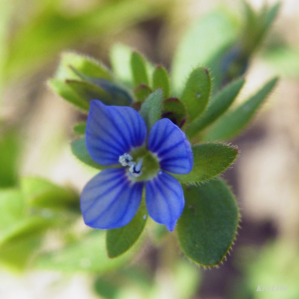 | OPIS | Kwiaty na bardzo krótkich, wzniesionych szypułkach (prawie siedzące) w kątach liści. Kielich złożony z 4 wolnych, lancetowatych, tępo zakończonych i silnie owłosionych działek. Korona kółkowa z bardzo krótką rurką. Ma szerokość 3-5 mm i złożona jest z 4 płatków niebieskiego koloru. Płatki nierównej wielkości, jeden z płatków wyraźnie mniejszy i węższy. Szyjka słupka o podobnej długości, jak wycięcie torebki, z pojedynczą szyjką wyższą od pręcików. 2 pręciki. Słupek i pręciki dojrzewają równocześnie.