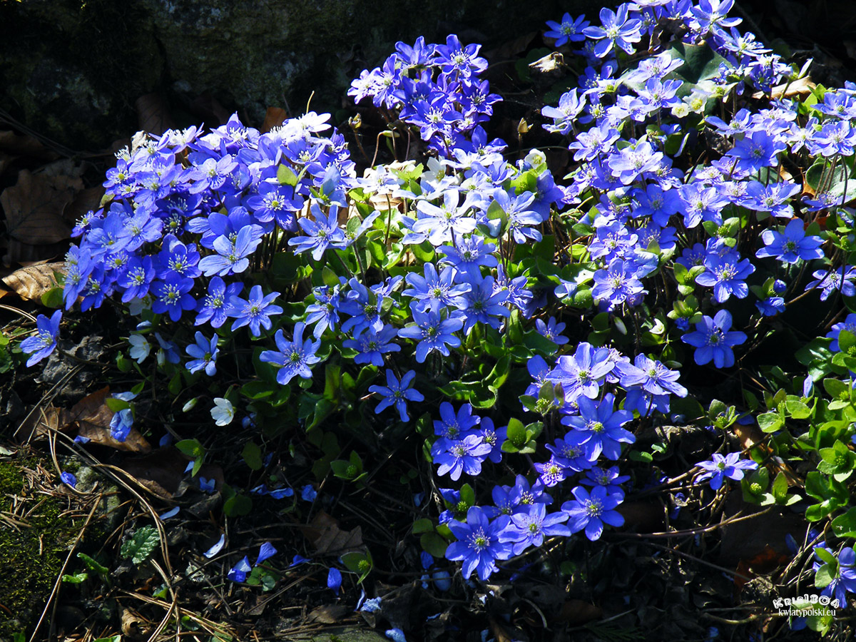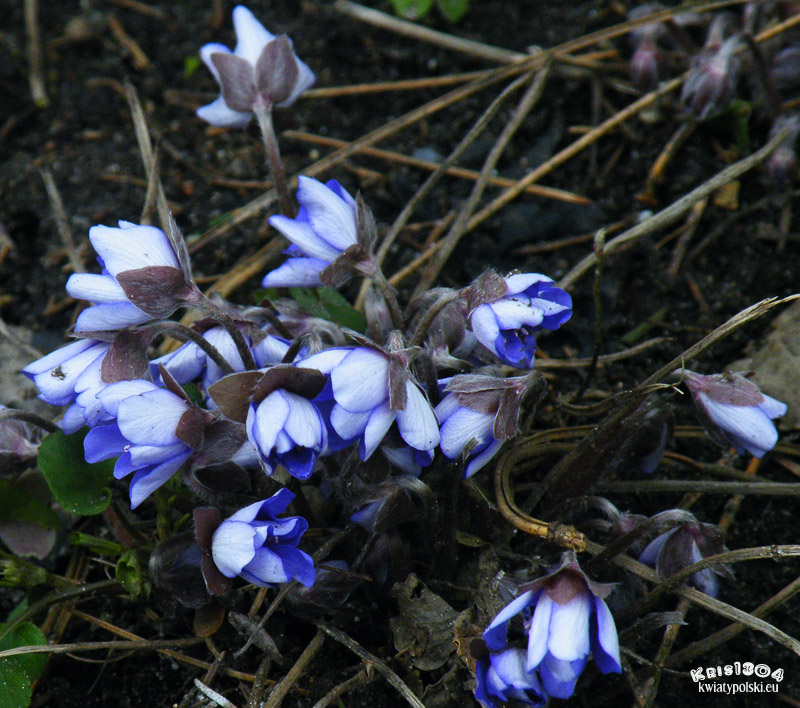 | OPIS | Kwiaty niebiesko-fioletowe pojawiają się wczesną wiosną na szypułkach wysokości 10 cm, zanim rozwiną się liście Czasem mają barwę różową, rzadziej białą. Pojedyncze kwiaty podparte są trzema niewielkimi, złączonymi listkami tworzącymi pozorny kielich. Listki te nie opadają, nawet podczas dojrzewania owoców.