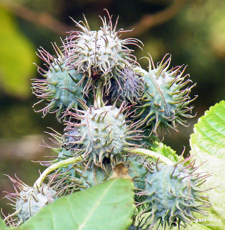 | OWOCE | Brodawkowatokolczaste, trójkomorowe torebki nasienne, pękające wzdłuż trzech szwów. W każdej komorze torebki znajduje się jedno nasiono. Nasiona o wielkości do 2 cm mają kształt owalny, ze szwem po brzusznej stronie, o twardej łupinie nasiennej, lśniące i mozaikowato zabarwione w różnych kolorach.