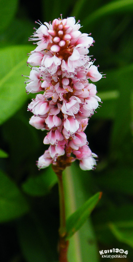 | OPIS | Kwiaty zebrane w długie, kłosowate, pstrokate kwiatostany. Kwiaty są początkowo białawe, później przyjmują odcień ciemnoróżowy.