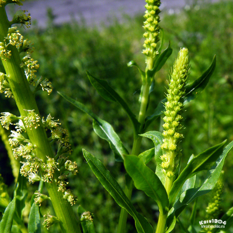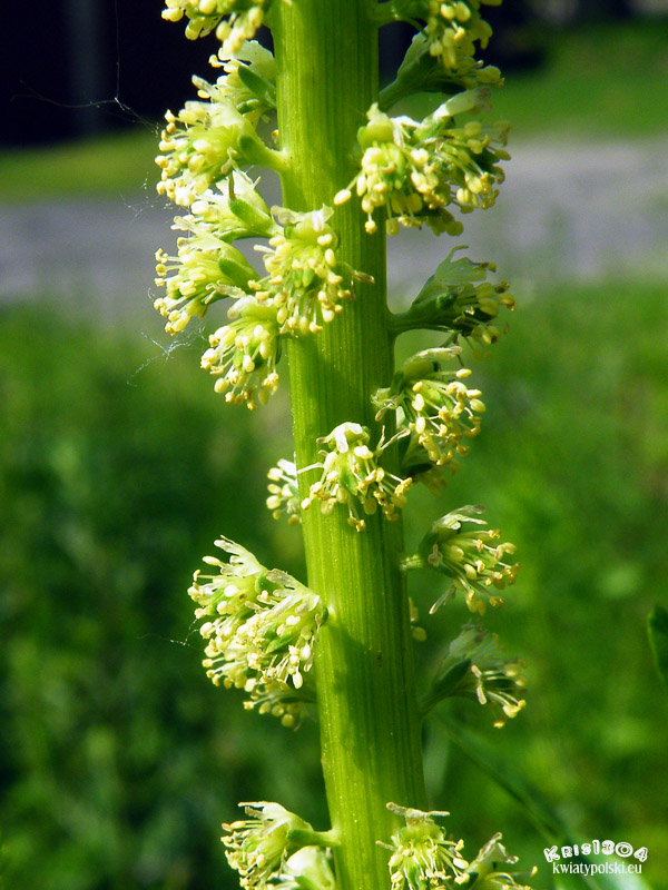 | OPIS | Kwiaty małe, w bardzo długich, wąskich, gęstych, zaostrzonych gronach. Pojedynczy kwiat składa się z 4 działek kielicha, 4 zielonożółtych 3-dzielnych płatków korony, słupka i licznych pręcików o trwałych nitkach.