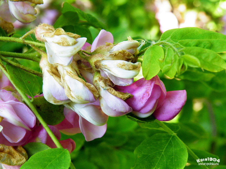 | OPIS | Kwiaty motylkowate, różowoczerwone, w zebrane zwisające, nastroszone grona, 15 cm dł.