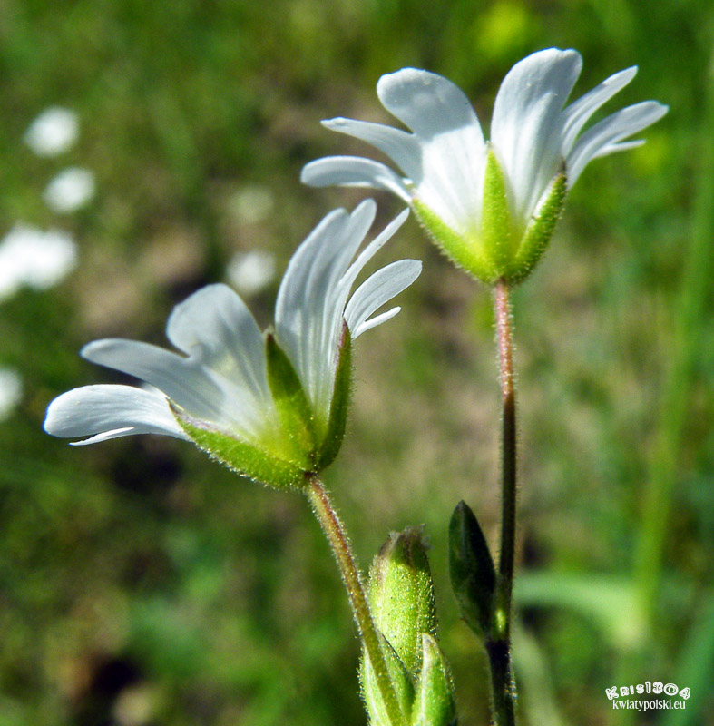 | OPIS | Kwiaty stosunkowo duże, po 3-12 zebrane w dwuramienną wierzchotkę na szczycie pędu kwiatowego. Wyrastają na wygiętych szypułkach, które wyprostowują się dopiero po dojrzeniu nasion. Działki kielicha mają długość 5-6,5 mm i są orzęsione lub ogruczolone i biało obrzeżone. 5 białych płatków korony o długości 8-11 mm z wycięciem dochodzącym do 1/3 ich długości.