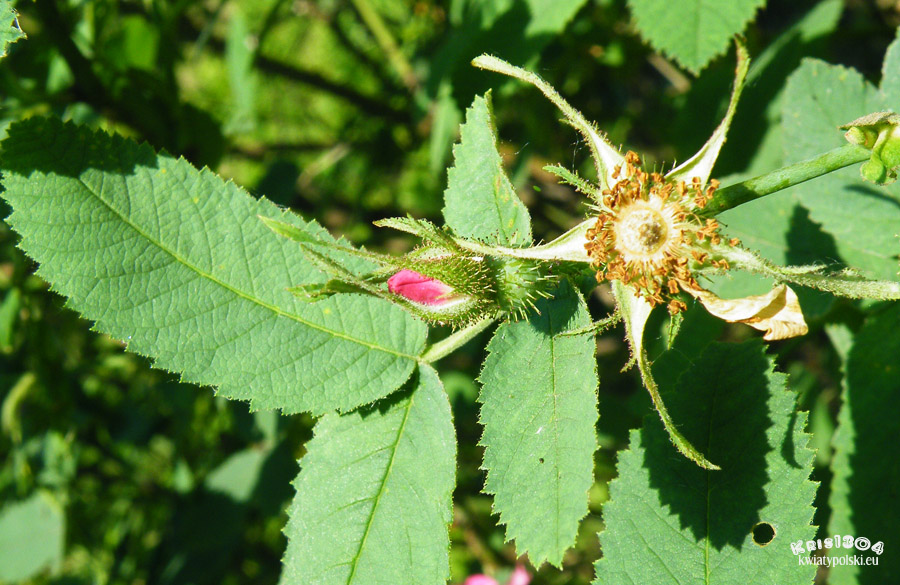 | OPIS | Kwiaty wyrastają na krótkich szypułkach pokrytych gruczołkami na trzoneczkach. Kwiaty pięciopłatkowe, pojedyncze, ciemnoróżowe. Dno kwiatowe kuliste i gęsto pokryte kolczastymi szczecinkami. Działki kielicha po przekwitnięciu kwiatów wzniesione do góry.