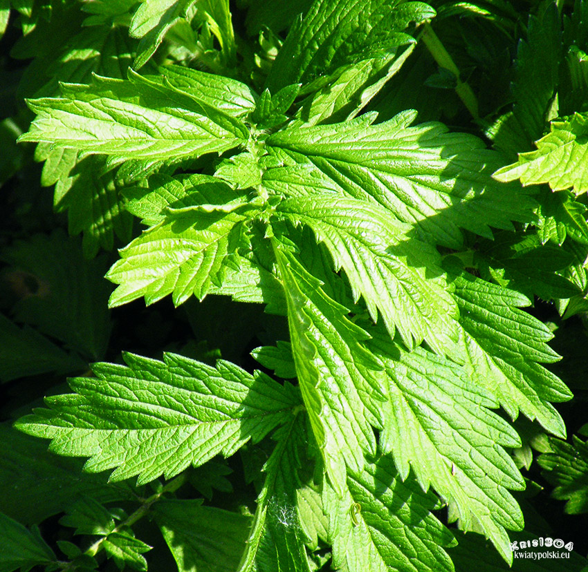 | LIŚCIE | Przerywano- nieparzystopierzaste z przylistkami. Odcinki liściowe w nasadzie długoklinowate, w dolnej części całobrzegie, w górnej połowie najszersze i brzegiem wcinano- piłkowane lub piłkowano-wrębne. Górna strona liścia naga lub z rzadka owłosiona, dolna - jaśniejsza z długimi, sztywnymi włoskami na nerwach i z licznymi, bardzo drobnymi, lśniącymi gruczołkami na całej powierzchni.