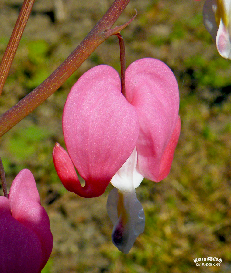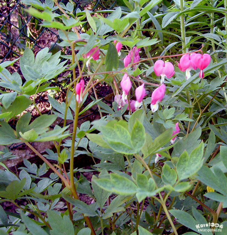 | OPIS | Kwiaty są zebrane w jednostronne, zwisające grono lub w kłos. Kwiaty złożone z 2-działkowego, odpadającego kielicha, 4 płatków korony, 1 słupka i 2 trójdzielnych pręcików. Dwa zewnętrzne płatki są półsercowate, różowoczerwone do czerwonych, zaś dwa wewnętrzne małe i białe. Spomiędzy różowych rozdętych płatków wyrastają dwa białe, sprawiające wrażenie wypływającej z serca kropli.