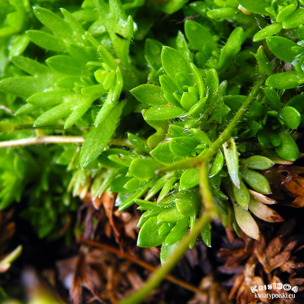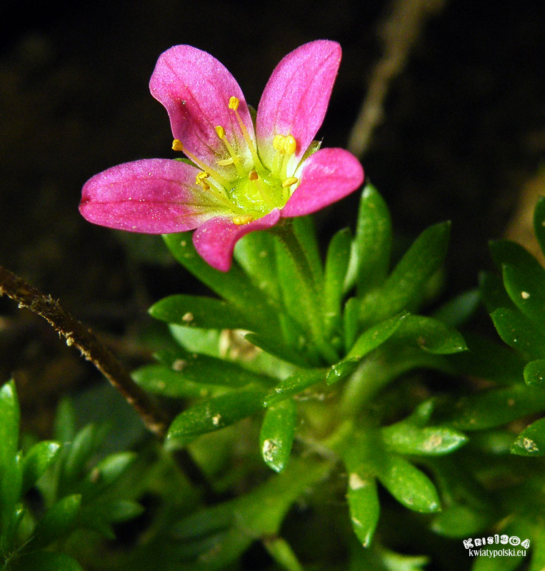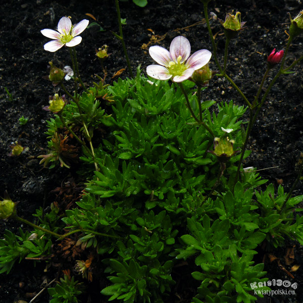 | OPIS | Kwiaty gęsto wyrastają na krótkich łodyżkach na szczycie poduszki. U typowej formy mają karminowy kolor i średnicę do 1,5 cm, 5 wolnych płatków korony, 5 działek kielicha, 10 pręcików i 2 słupki. Podczas przekwitania płatki korony bledną, a łodyżki kwiatowe wydłużają się.