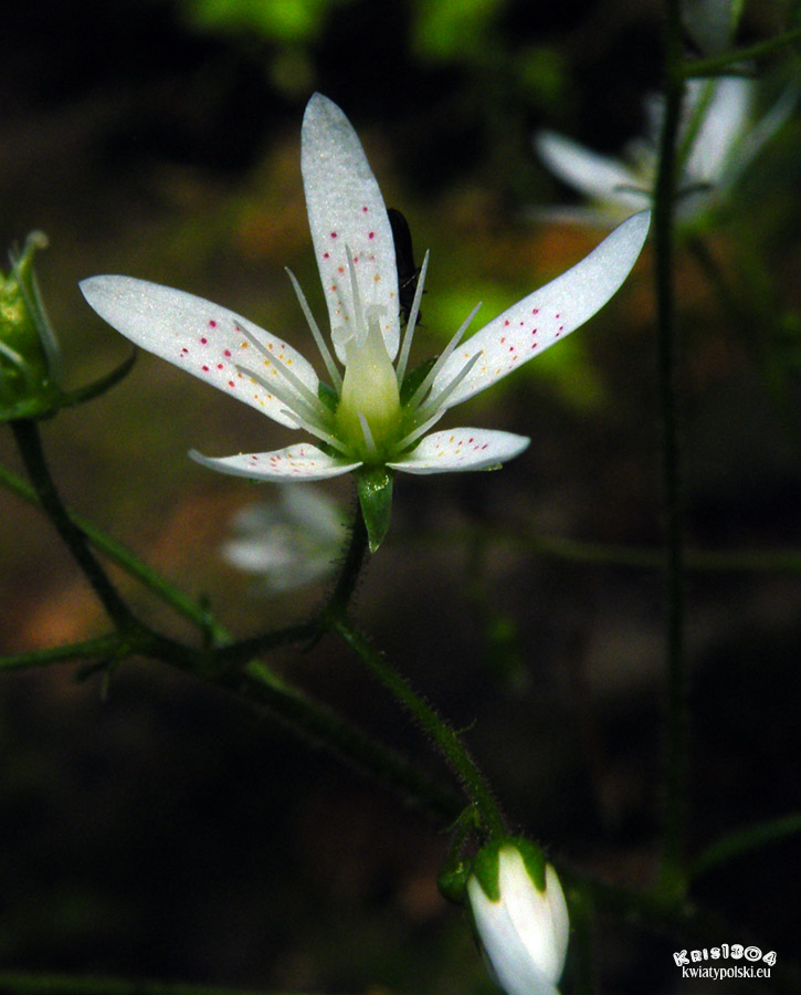 | OPIS | Kwiaty zebrane w rozpierzchlą wierzchotkę na szczycie łodygi. Kwiat promienisty, 5-krotny. Działki kielicha gruczołowato owłosione. Płatki korony mają długość 6-9 mm i są 2-3 razy dłuższe od działek kielicha. Mają podługowaty kształt, są białe i czerwono lub żółto nakrapiane. Wewnątrz korony 5 pręcików i pojedynczy słupek.