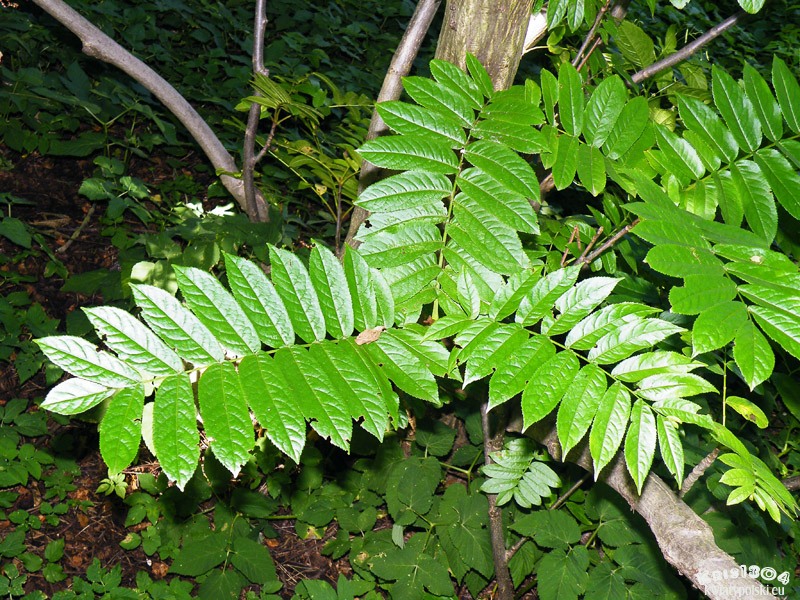 | LIŚCIE | Liście nieparzystopierzaste o długości do 45 cm składające się z 11-27 listków, listki długości 5-11 cm i szerokości 2-4 cm. Górna strona liści ciemnozielona i błyszcząca, dolna matowozielona z kępami białych włosków pod nerwem głównym. Listki o brzegu rzadko piłkowanym. Listki środkowej pary są największe. Jesienią przebarwiają się na żółto.