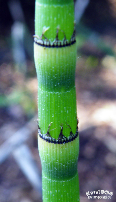 | ŁODYGA | Wykształca pędy niezróżnicowane na płonne i płodne. Pędy nadziemne zielone, do 80 cm długości, płożące lub wzniesione, nierozgałęzione lub rozgałęzione nieregularnie. Łodyga jest zielona, rozgałęziona nieregularnie lub wcale. Wewnątrz z szerokim przewodem powietrznym. Międzywęźla mają po 3-10 cm długości i są żeberkowane. Między 6-26 wypukłymi, szorstkimi żebrami, znajdują się głębokie rowki.
