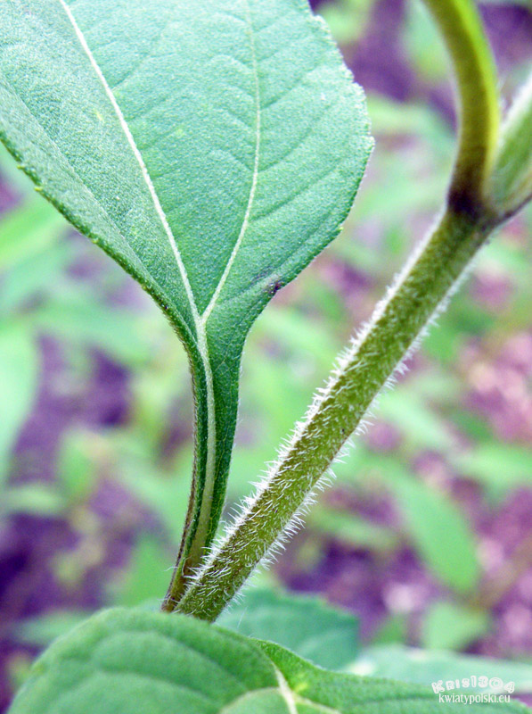 | ŁODYGA | Wzniesiona, prosta. Przekrój ma prawie okrągły, jest podłużnie bruzdowana, często czerwono nabiegła, a poza tym cała szorstko, białawo owłosiona. Sztywne, zagięte i nierównej długości włoski są gęste, zwłaszcza w górnej części pędu.