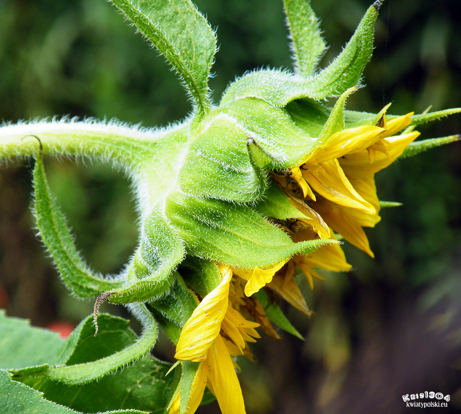 | OPIS | Kwiaty zebrane w bardzo duże kwiatostany typu koszyczek, o średnicy do 30 cm. Koszyczki zwisające po przekwitnięciu. Brzeżne kwiaty języczkowe są duże i żółte, zaś środkowe kwiaty rurkowe - drobne i brunatne.