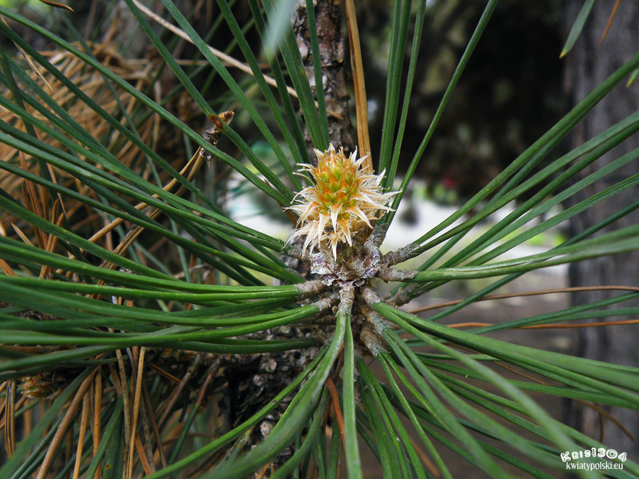 | LIŚCIE | Igły w pęczkach po 2, spłaszczone, sztywne, ciemnozielone i spiczaste, długości 4-18 cm, grubości 1-2 mm, dłuższe, grubsze i bardziej sztywne niż u sosny pospolitej.