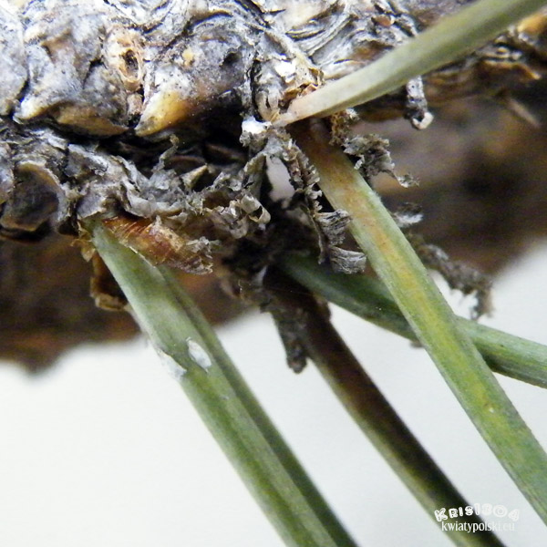 | KORA, PĘDY | Kora o barwie ciemnobrązowej w zagłębieniach po szarobrązową z wierzchu, bruzdowata, podzielona na płytki o prawie kwadratowym kształciej, (gałęzie jak gdyby pokryte warstewką smoły) w młodości często z charakterystycznymi, haczykowato odstającymi końcami łusek.