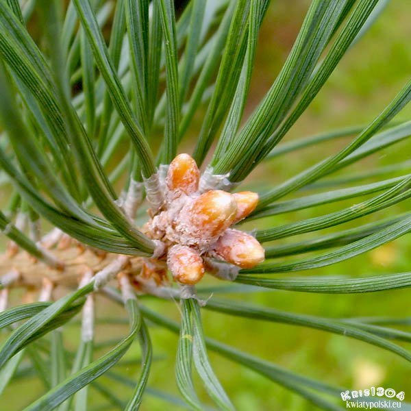 | LIŚCIE | Igły szarozielone do niebieskozielonych, osadzone parami na krótkopędach, długości 3-8 cm, sztywne, skręcone dookoła swojej osi. Pary igieł osadzone są promieniście i prostopadle do osi.