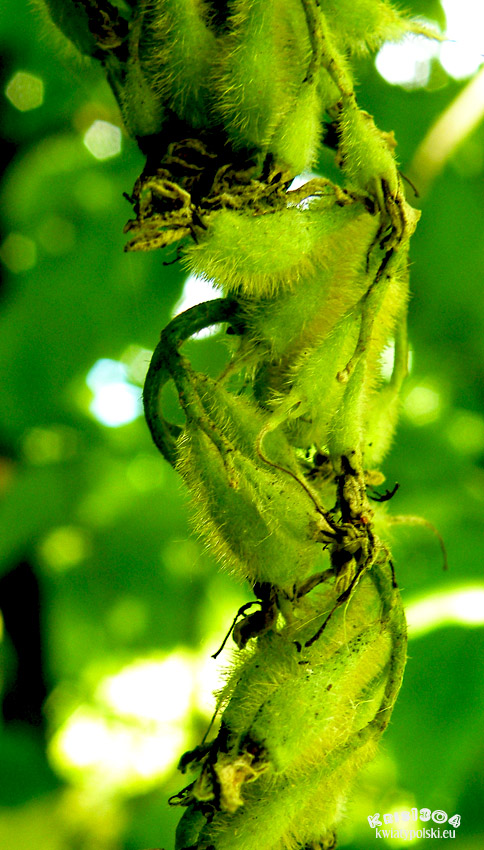 | OWOCE | Jesienią między liśćmi zwisają długie owocostany pokryte brązowymi włoskami.