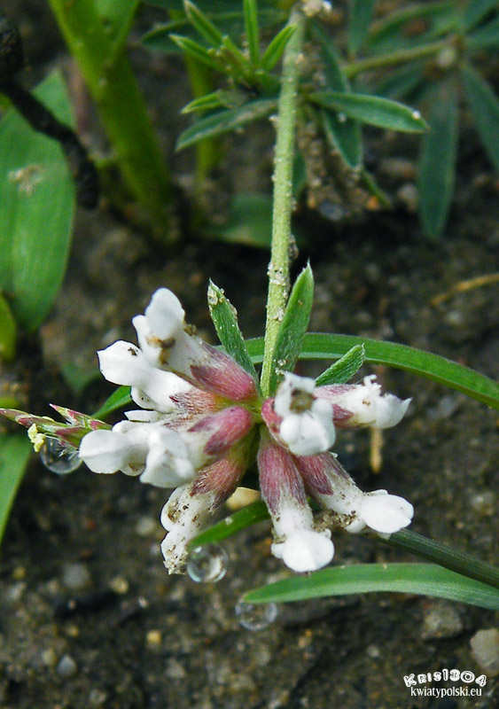 | OPIS | Kwiaty białe z fioletową łódeczką i owłosionym kielichem, rozmieszczone po 6-14 w główkowatych baldaszkach.