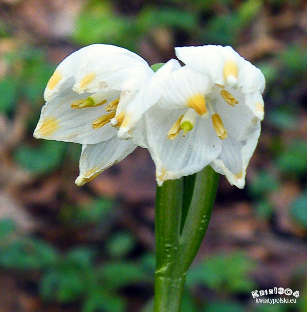 | OPIS | Kwiat jeden, rzadko dwa na szczycie łodygi, dzwonkowaty, pachnący, zwieszony. Działki okwiatu jednakowej długości, białe z żółtozieloną plamką pod szczytem. Słupek dolny o silnie zgrubiałej szyjce, pręcików sześć, krótszych od działek okwiatu.