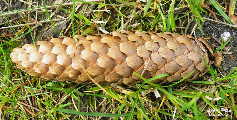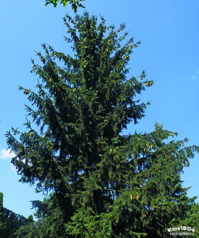 | POKRÓJ | Korona smukła, stożkowata. Dolne konary z wiekiem zwieszają się, górne pozostają w większości poziomo. Pień osiąga wysokość 40-50 m, średnica pnia do 1,5 m. Pokrój świerka pospolitego przez całe życie pozostaje regularnie stożkowaty, a jego długi wierzchołek zawsze jest wyprostowany.