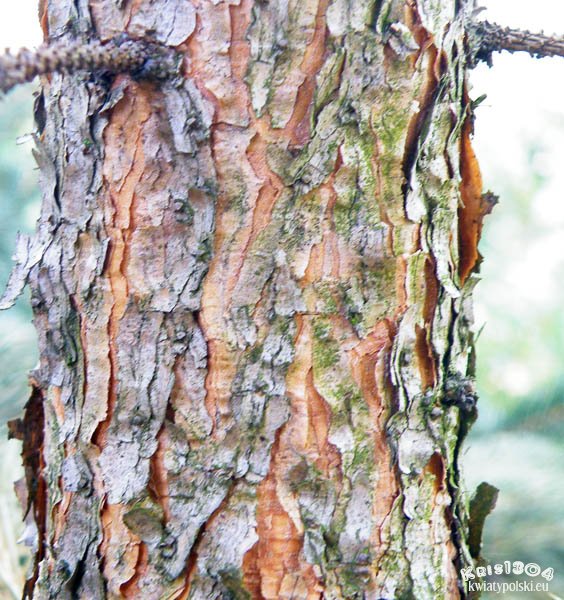 | KORA, PĘDY | Kora od różowawobrązowej poprzez sarobrązową do brunatnoszarej, stosunkowo cienka, chropowata i płytko, łuskowato spękana na małe, odpadające poletka, w miejscach uszkodzeń często pokryta białymi naciekami żywicy. Młode pędy bruzdowane, żółtawe lub żółtobrązowe, nagie lub nieznacznie owłosione. Przyrosty roczne na końcach pędów gęsto pokryte soczyście jasnozielonymi, miękkimi szpilkami. W sprzyjających warunkach boczne przyrosty mogą osiągać do 30(50)cm długości, a szczytowy - nawet do 80cm. Pąki jajowate, lekko zaostrzone, jasno- do ciemnobrązowych, z cienkimi, przeważnie zaostrzonymi łuskami, boczne podobnej wielkości co wierzchołkowe, odstające od pędu.