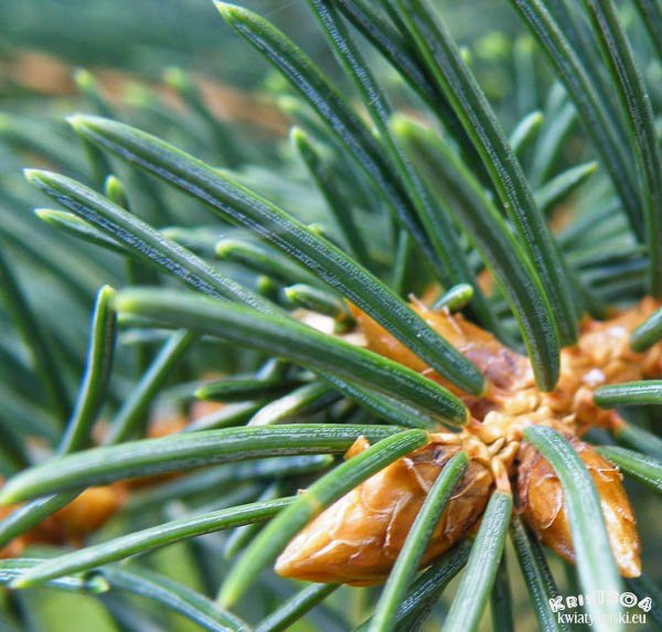 | LIŚCIE | Szpilkowate, długości 1.5-2.5cm, dość sztywne i szpiczasto zakończone przez co bardzo kłujące, czterokanciaste w przekroju, ciemnozielone, od spodu z dwoma delikatnymi, biało nakrapianymi paskami. Igły wyrastają pojedynczo. Są osadzone na małych, brązowych trzoneczkach, a po opadnięciu zostawiają na gałązce ostrą bliznę.