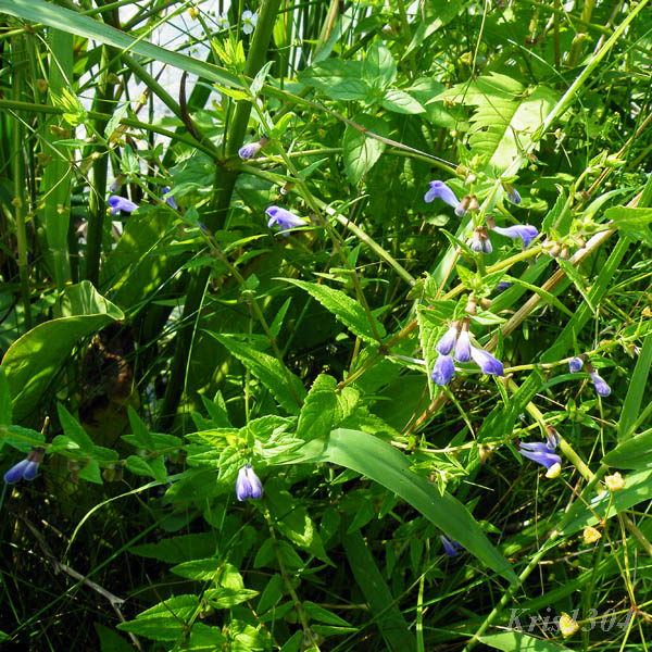 | OPIS | Kwiaty grzbieciste, dwuwargowe, wyrastające na krótkich szypułkach w kątach liści. Są fioletowoniebieskie, rzadko tylko zdarzają się różowe. Mają długość 1,2-2 cm, dolną wargę z wyciętą klapą, górną z tarczkowatą łuską na szczycie. Rurka korony silnie zgięta. Kielich grzbietobrzusznie spłaszczony, nagi lub owłosiony.
