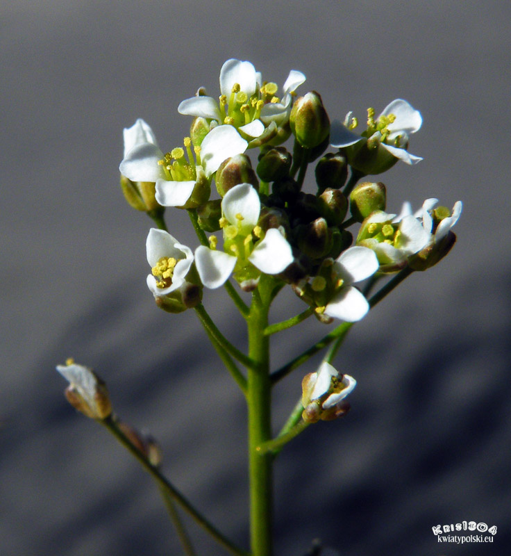 | OPIS | Kwiaty w luźnych gronach zakończonych baldachogronem. Zalążnia i owoce sercowatotrójkątne, wzniesione, szeroko rozstawione, odchylone ku dołowi.