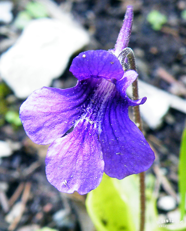 | OPIS | Kwiaty wyrastają z różyczki liściowej na ogruczolonych szypułkach o wysokości 5-30 cm, pojedynczo. Są to kwiaty grzbieciste o dwuwargowym kielichu.