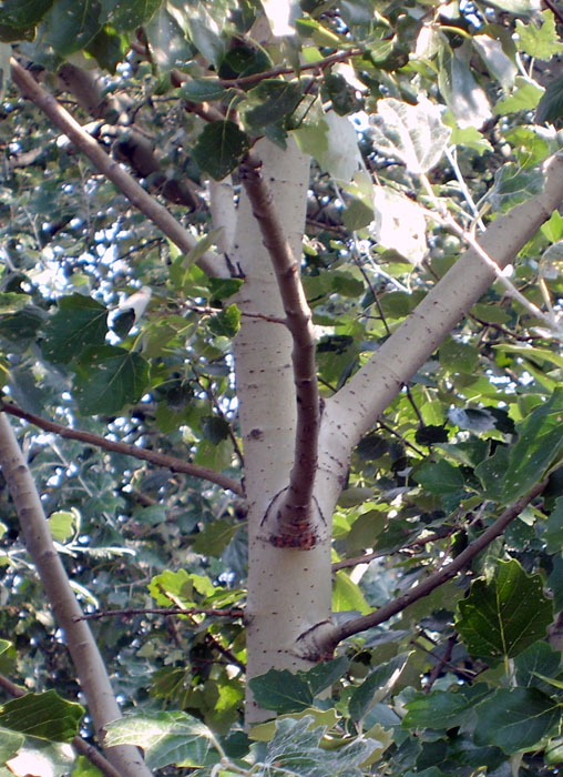 | KORA, PĘDY | Ma na pniu mocno spękaną szaro-białą korę. W wyższych częściach pnia kora srebrzystoszara z dużymi przetchlinkami, o charakterystycznym romboidalnym kształcie. Starsze gałęzie mają kremowo-białą barwę i posiadają wyraźnie widoczne blizny. U starszych drzew pnie mają czarny kolor. Młode pędy, oraz pączki obficie okryte białym kutnerem, który utrzymuje się podczas zimy. Pączki z wyraźnymi łuskami.