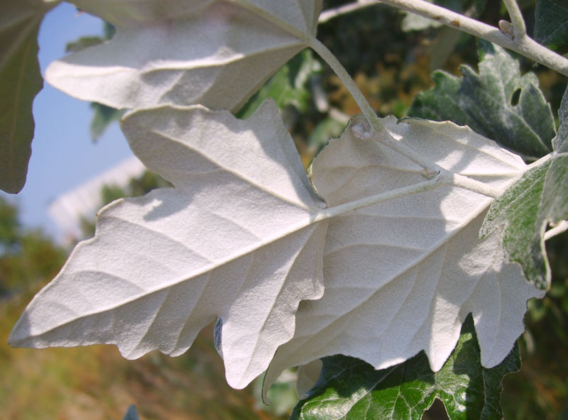 | LIŚCIE | Ulistnienie skrętoległe. Liście 3-5 klapowe o długości 6-12 cm. Ogonek liściowy długi i bocznie spłaszczony. Duże liście na długopędach mają długi ogonek i są głęboko klapowane. Od góry ciemnozielone i błyszczące, od spodu pokryte kutnerem i wybitnie srebrzyste. Liście na krótkopędach mają brzegi faliste, są mniejsze, zaokrąglone, nie są klapowane. Boczne nerwy liści nie dochodzą do ząbków. Jesienią przebarwiają się na żółto lub brązowo.