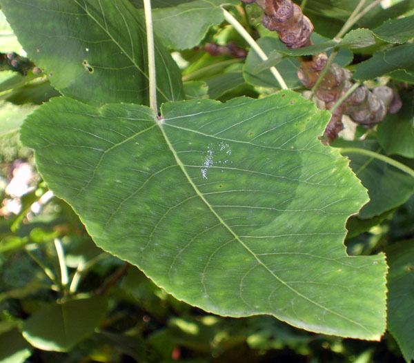 | LIŚCIE | Ma bardzo duże, sercowate liście (o średnicy nawet powyżej 30 cm) o nieprzeświecającym obrzeżu blaszki liściowej i niespłaszczonym ogonku, sercowate u nasady, młode pokryte gęstym, szarym kutnerem, starsze nagie, matowe.